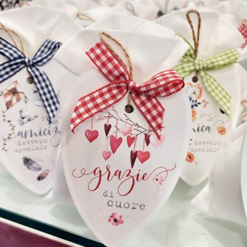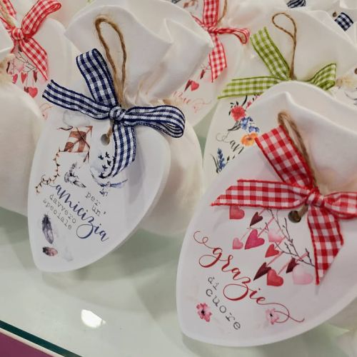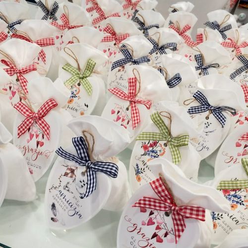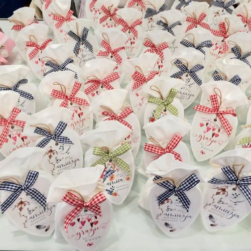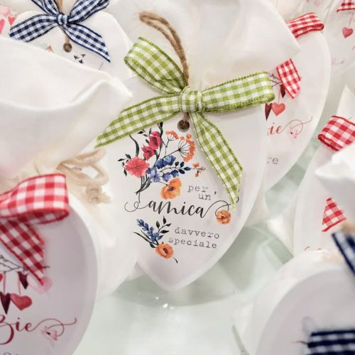 ๐ Cuore personalizzato con frasi dedicate, in 3 varianti con fiocco, sacchettino in cotone bianco e confetti naturalmente Maxtris.