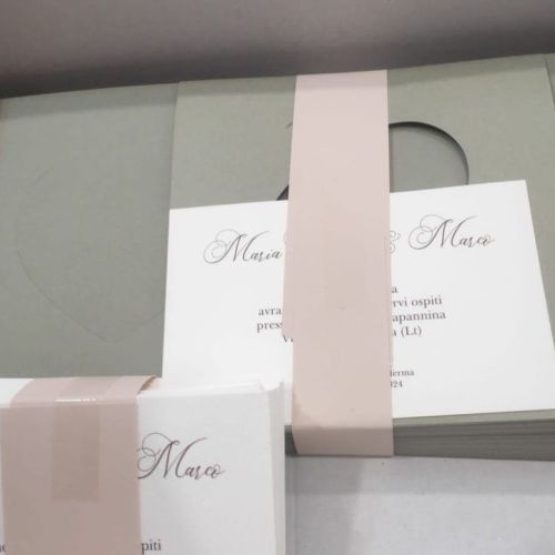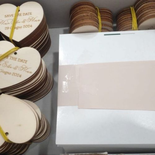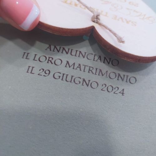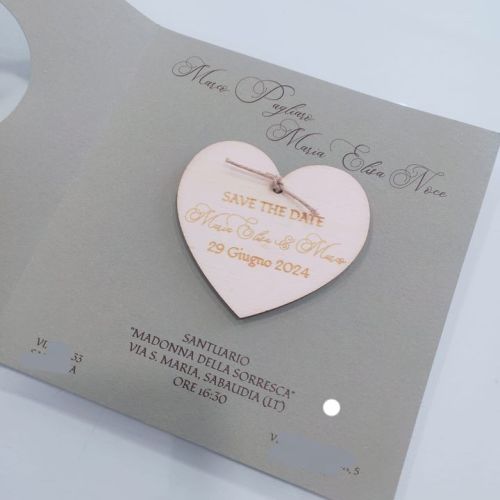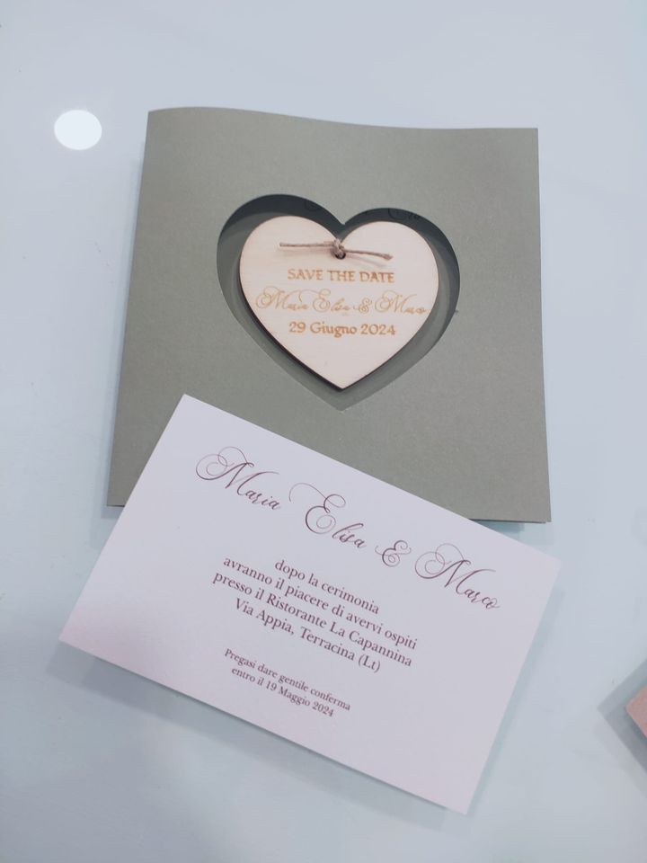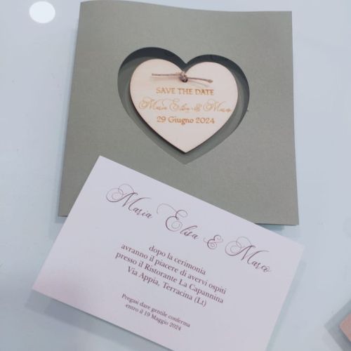 Originale partecipazione realizzato con carta martellata verde, cuore tagliato a laser che fa da cornice al tag interno in legno inciso con i nomi degli sposi e la data del matrimonio, busta inclusa