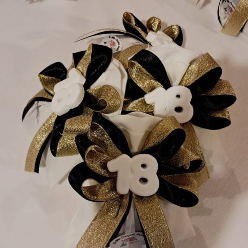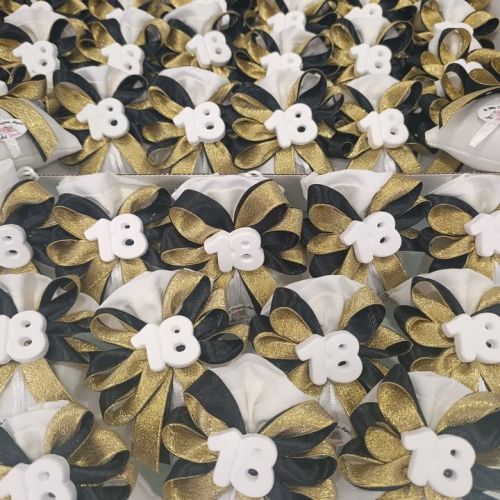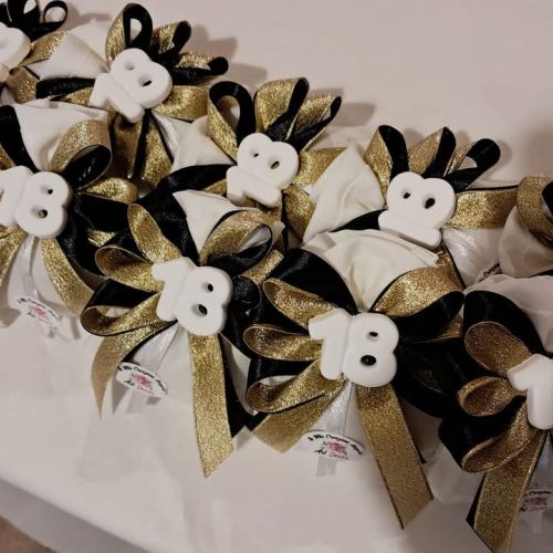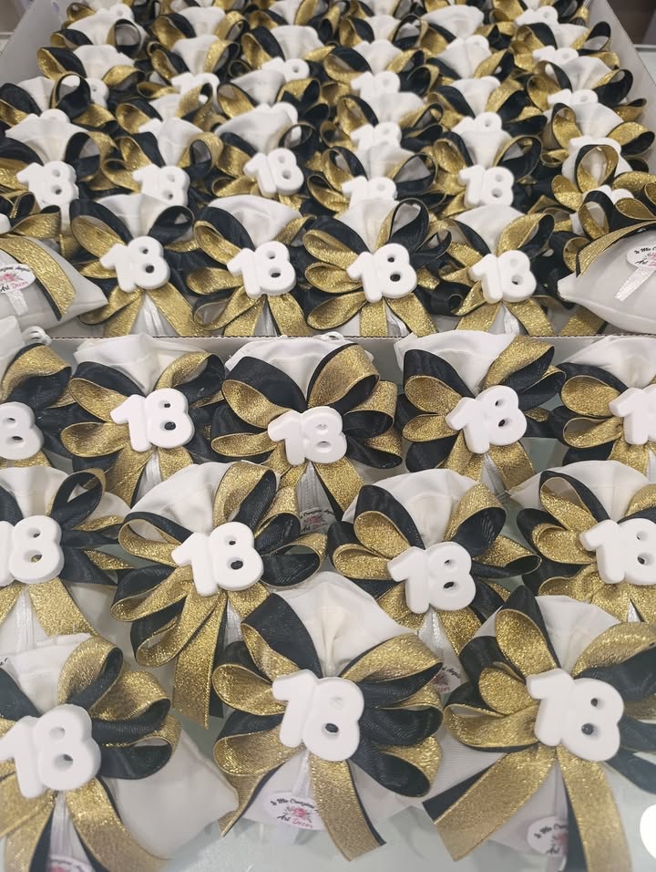 Guardate che meraviglia questi sacchettini: un gessetto numero ’18’ elegante, rifinito con un fiocco in perfetto abbinamento oro e nero, e naturalmente, i deliziosi confetti Maxtris per sigillare la festa! 🖤💛