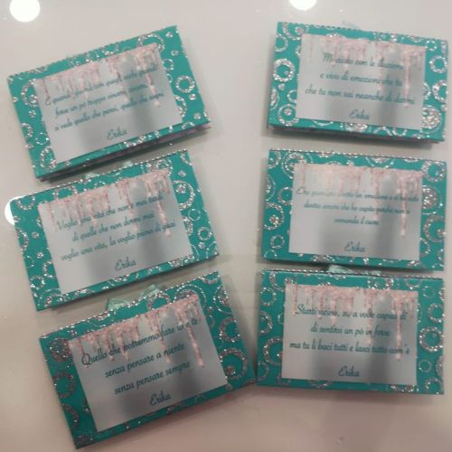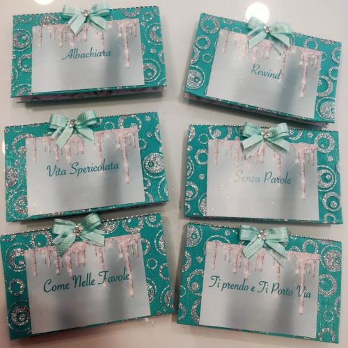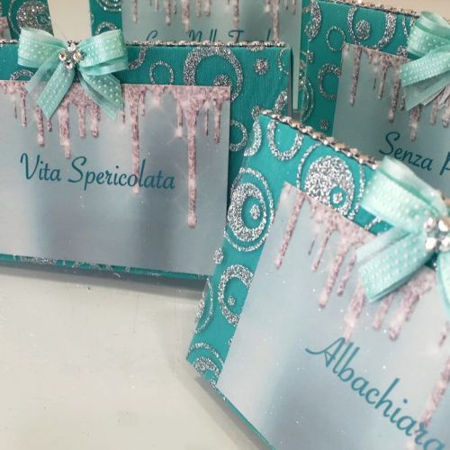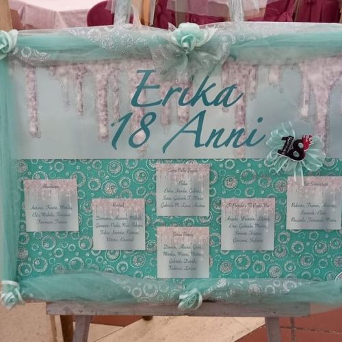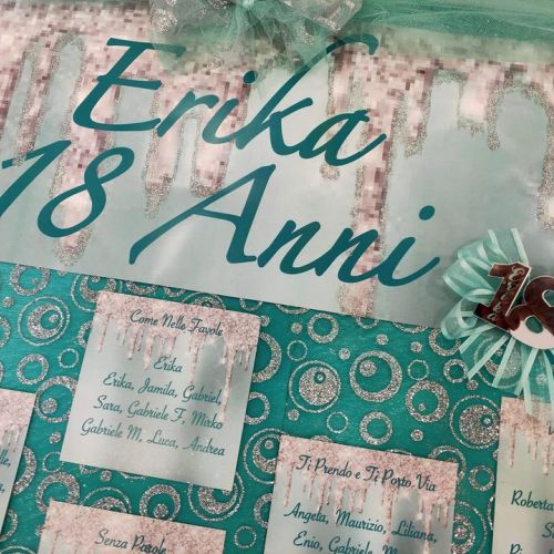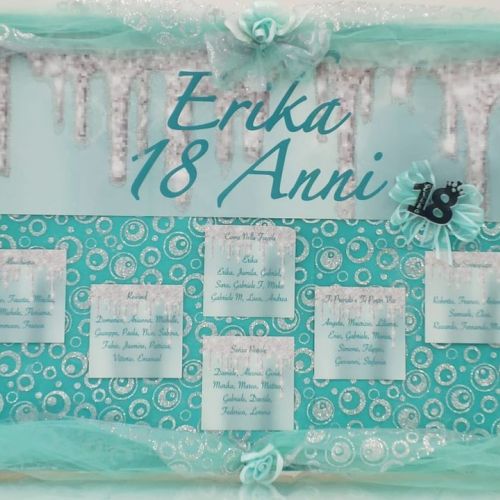🥂Il tableau dei commensali nel colore Tiffany con tulle argento abbinato ai segnatavolo, il nome Erika abbinato perfettamente. 🥂Sulla torta bomboniera un kake Topper con la scritta Buon compleanno Erika.