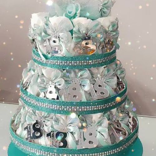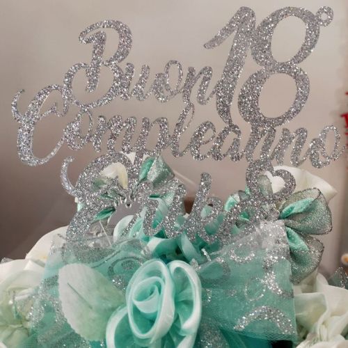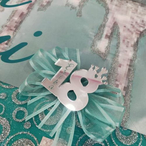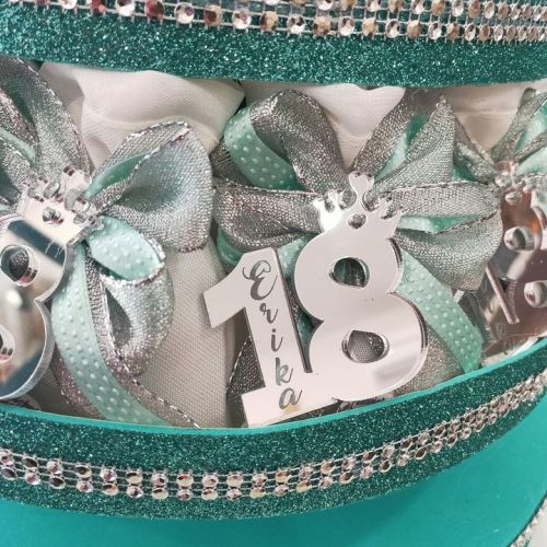 🥂Per Erika ho realizzato una calamita con il numero 18 in plexiglass specchiato e l’incisione del suo nome, confezionata con sacchetto bianco e fiocco Tiffany e argento il tutto confermato in una graziosa torta bomboniera.