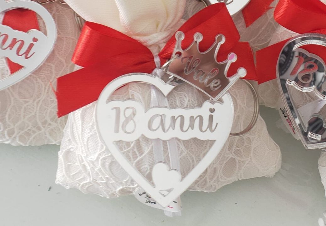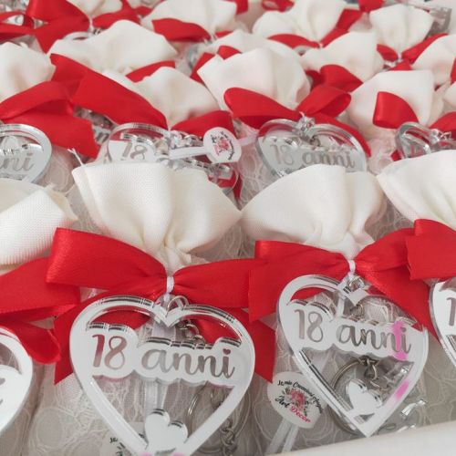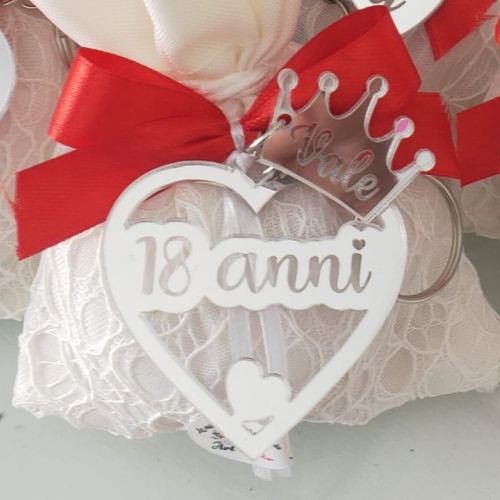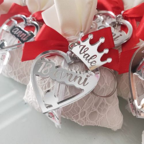🥂Portachiavi in plexiglass specchiato argento a forma di cuore, intagliato con ciondolo a corona e il suo nome inciso, sacchetto elegante in pizzo bianco con fiocco rosso