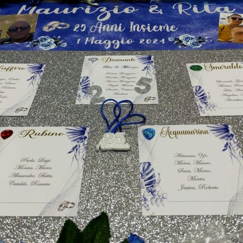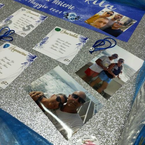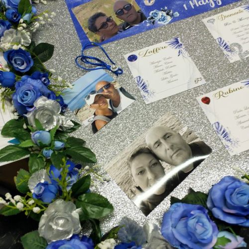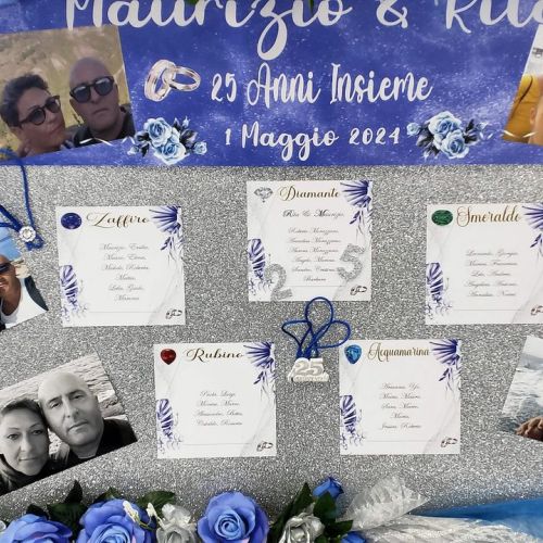 Il tableau a tema pietre preziose con fiori e boccioli in blu e argento con le foto di questi anni insieme🥂❤️ naturalmente con i segna tavolo abbinati e alcune curiosità sulle pietre scelte.