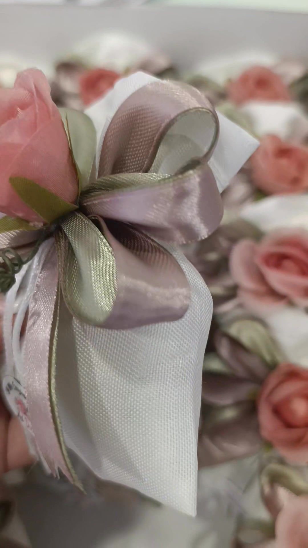 Per lei ho realizzato un sacchetto elegante con fiocco verde salvia e rosa antico, arricchito da deliziosi confetti Maxtris: un cadeau raffinato e dolcissimo, pensato per celebrare questo giorno speciale con parenti ed amici.