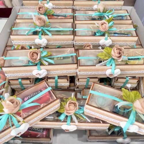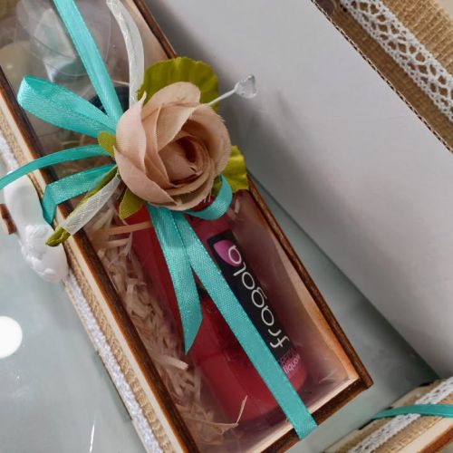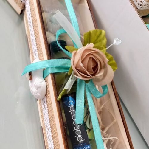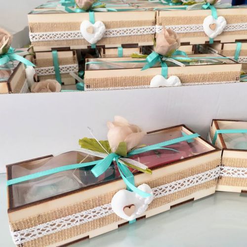 Hanno scelto una scatolina in legno artigianale, decorata con nastro di juta, pizzo bianco, un delicato gessetto a forma di cuore e un fiocco color Tiffany con cuore lux e fiorellino, il tutto interamente assemblato e lavorato a mano.π