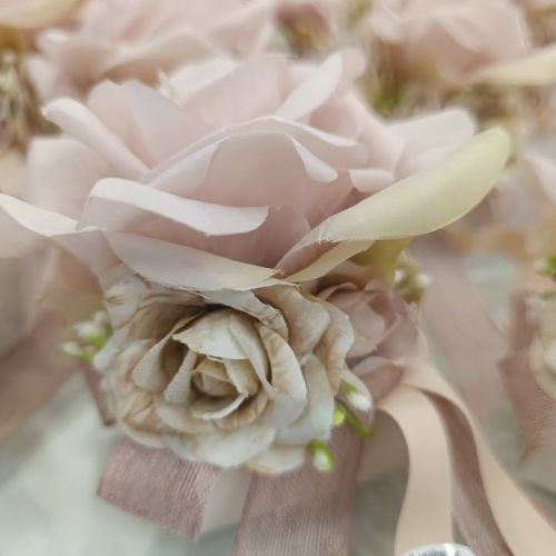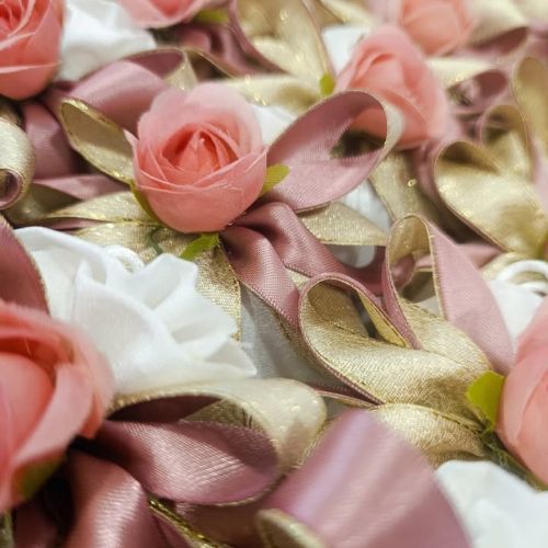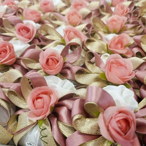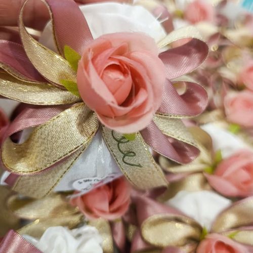 Per i suoi cari, sacchettini con confetti decorati con un fiocco bicolore rosa antico e oro, completati da una rosetta in stoffa artigianale, per un tocco di classe e personalità.