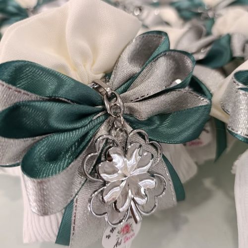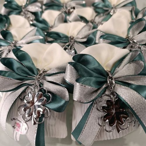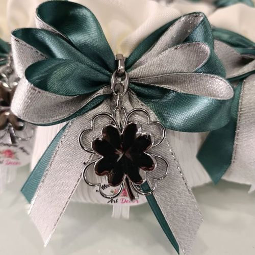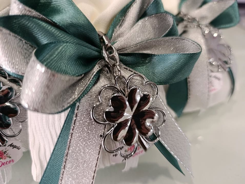 Per questa occasione speciale, ho creato un sacchetto bianco con un elegante fiocco bicolore, verde petrolio e argento arricchito da un portachiavi a forma di quadrifoglio, simbolo di fortuna, amore e speranza. Ogni quadrifoglio è un piccolo augurio di prosperità e gioia per il futuro, un segno che accompagna chi lo riceve in ogni nuovo passo della sua vita.