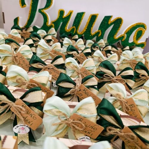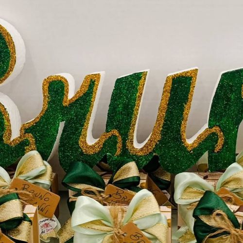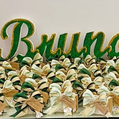 A completare lโallestimento, un tocco personalissimo: il nome “Bruno” realizzato a mano in polistirolo, dipinto con cura nelle stesse tonalitร delle bomboniere, per armonia e stile in ogni dettaglio.
