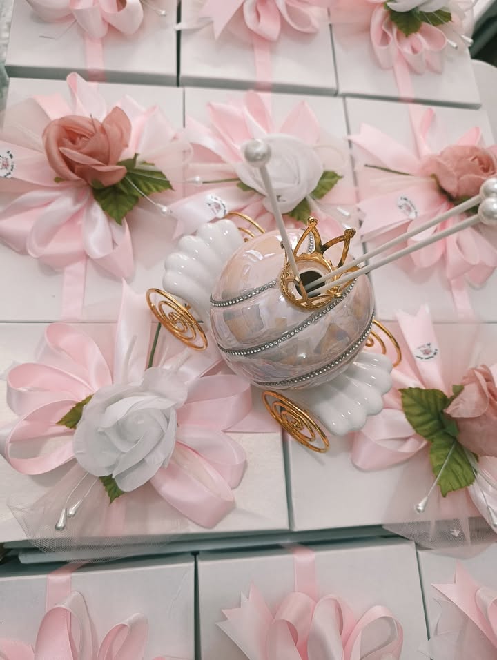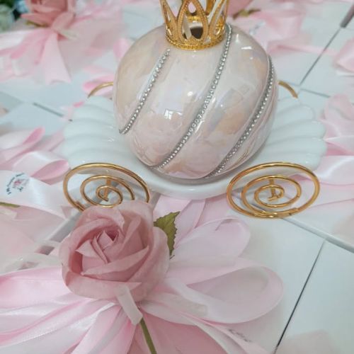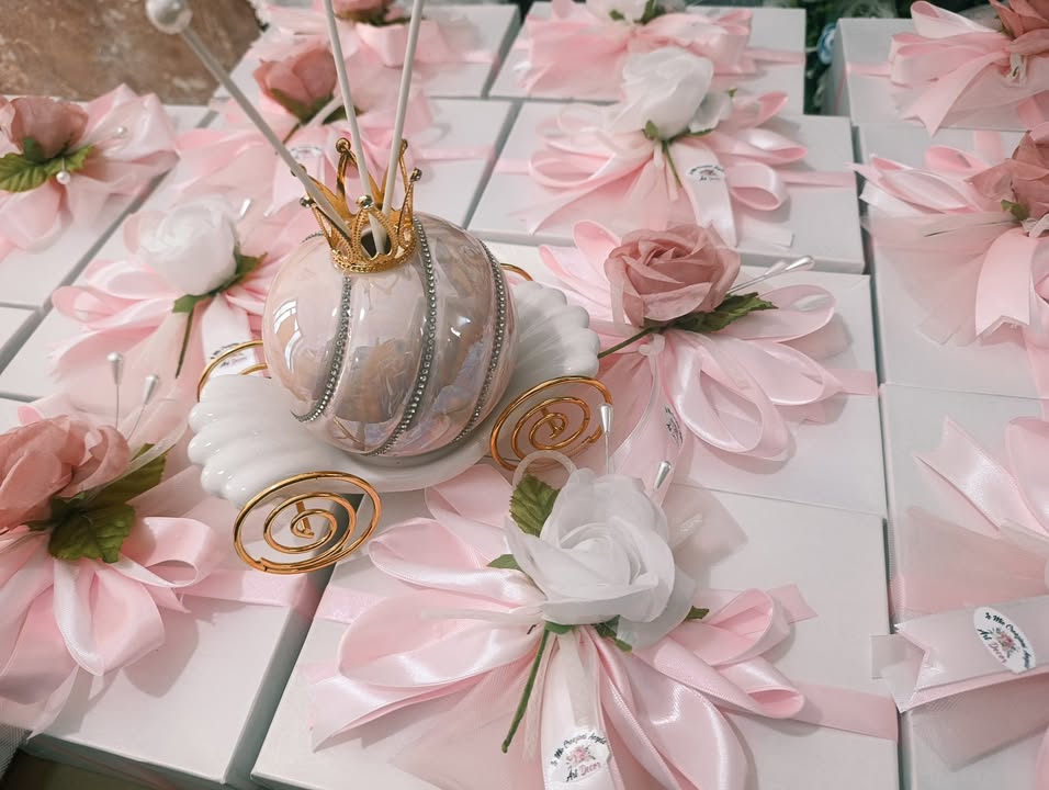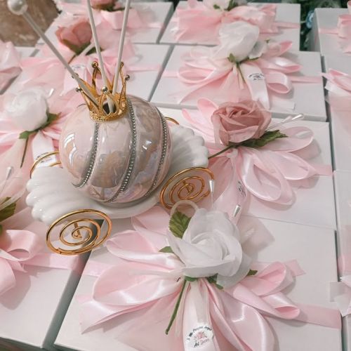 Per celebrare questo giorno unico e speciale, i suoi genitori hanno scelto come bomboniera un elegante profuma ambiente a forma di carrozza di Cenerentola in porcellana, firmata Le Stelle.