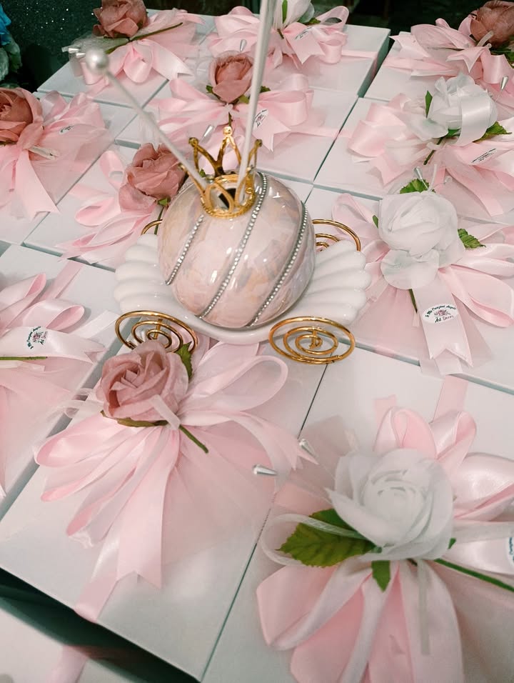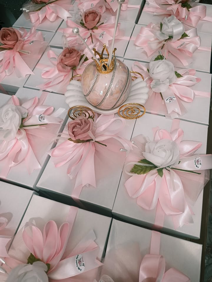 Il confezionamento è stato curato nei minimi dettagli: nastro rosa e bianco alternati, arricchiti da una grande rosa bicolore, per un tocco romantico e fiabesco. 🌹✨