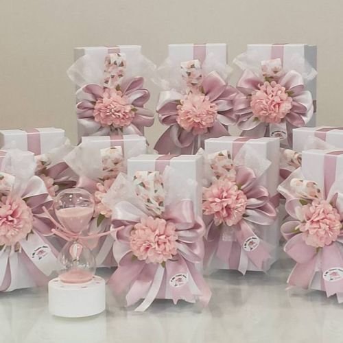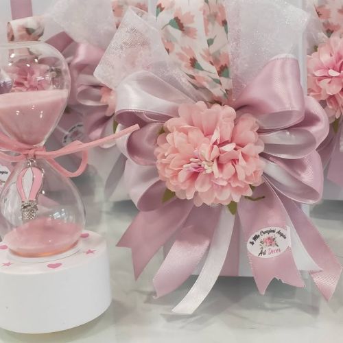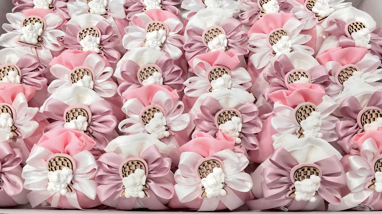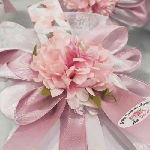 Confezione della bomboniera nei toni del rosa e bianco e fiore, on confetti Maxtris.