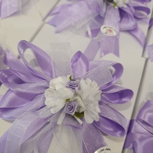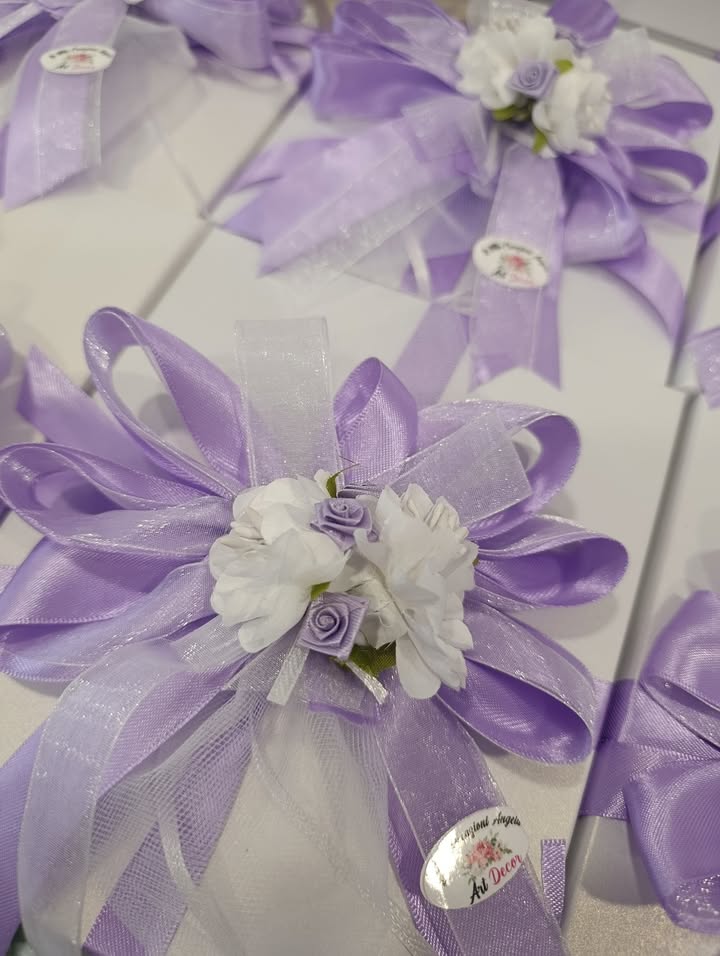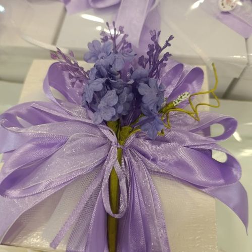 ​Ho curato ogni dettaglio con affetto, scegliendo la composizione nei delicati colori lilla e bianco, con fiore e sacchetto pronti ad accogliere i confetti.