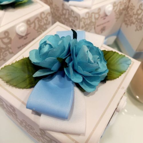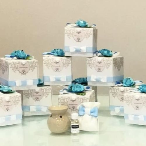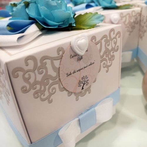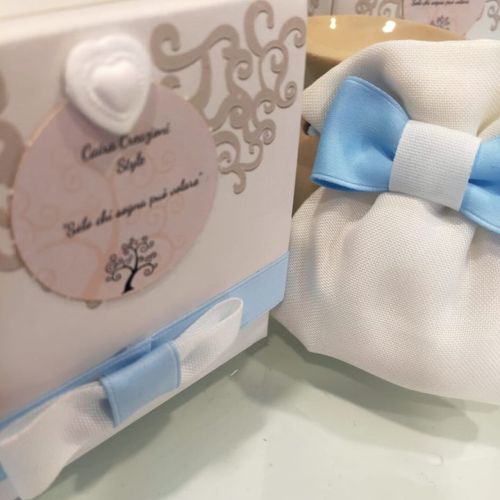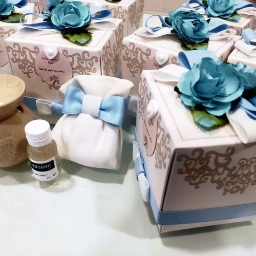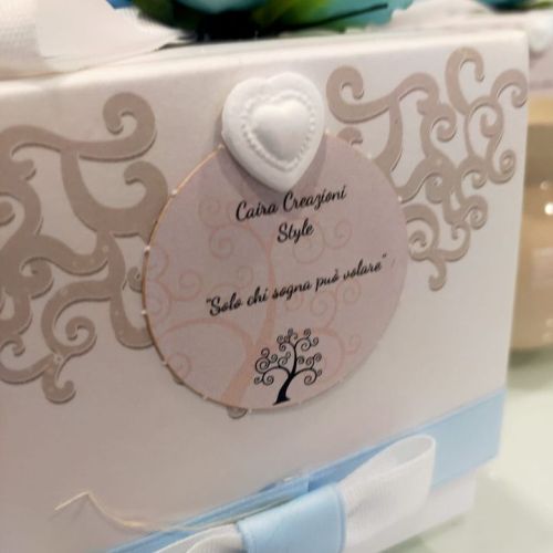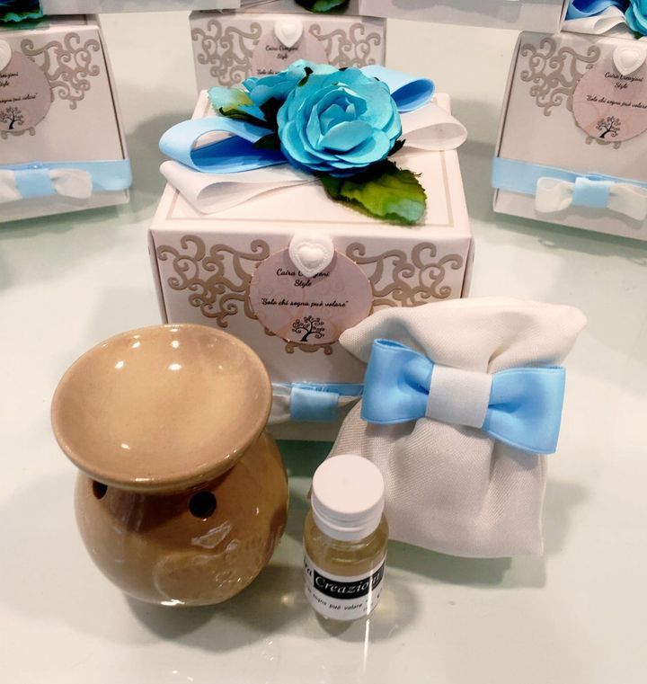🩵🕊️ Accurata la scelta del cadeau Caira Creazioni, a ricordo di questo giorno importante è il bruciatore con candela ed essenza in scatola decorata con🩵 sacchetto abbinato e confezione nei colori bianco e celeste