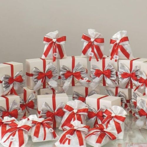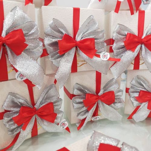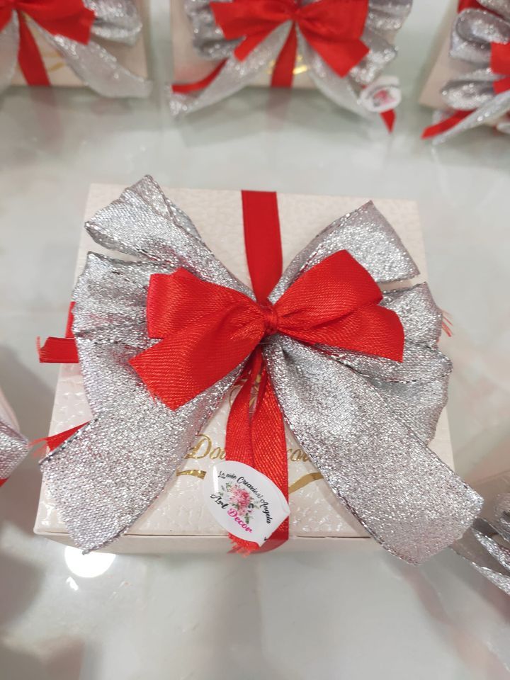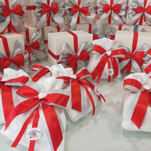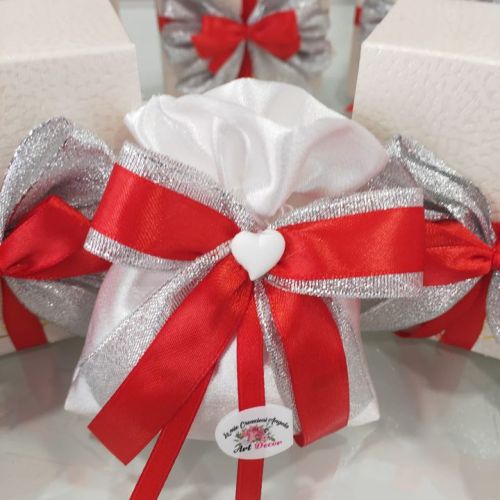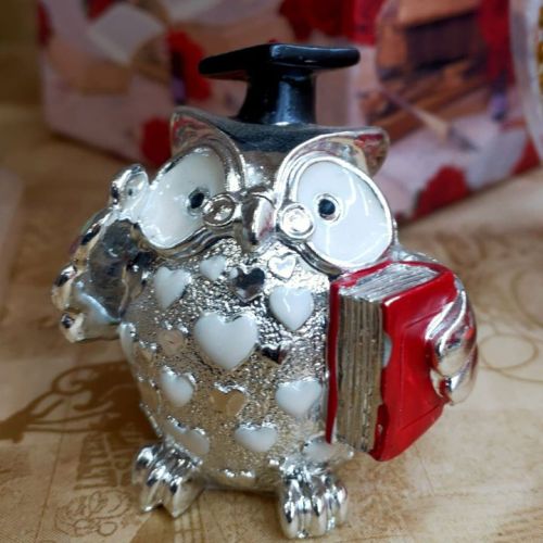 🎓 Gufetto argento con libro rosso con sacchettino bianco in raso con fiocco argento e rosso con cuoricino bianco.