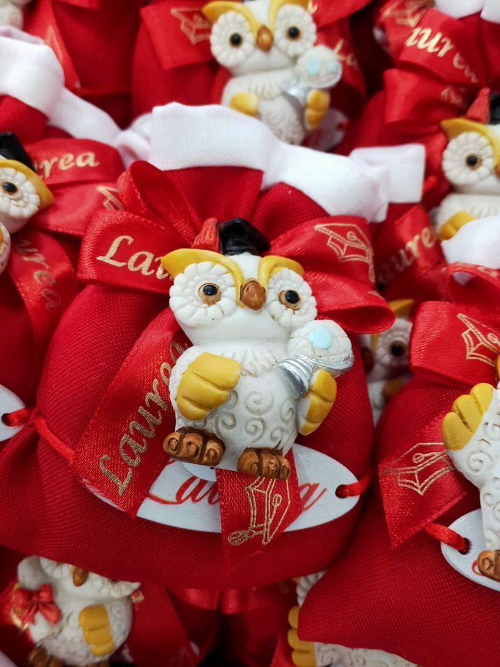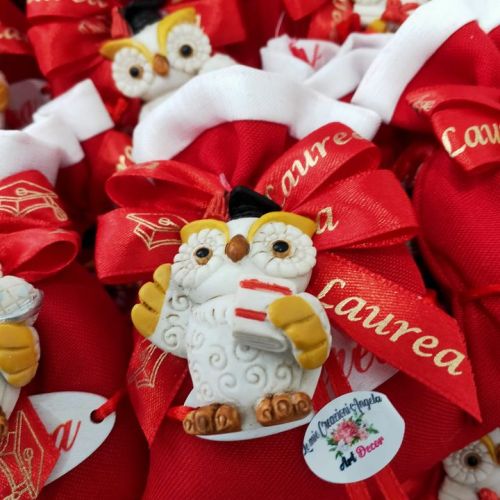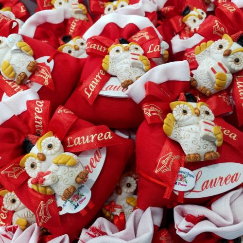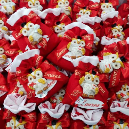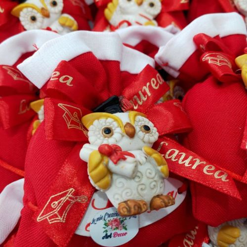 🎓🦉Sacchetto rosso con bordo bianco e scritta laurea in legno bianco applicato al sacchetto.