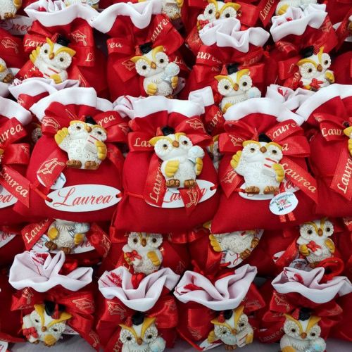 🎓🦉Sacchetto rosso con bordo bianco e scritta laurea in legno bianco applicato al sacchetto.