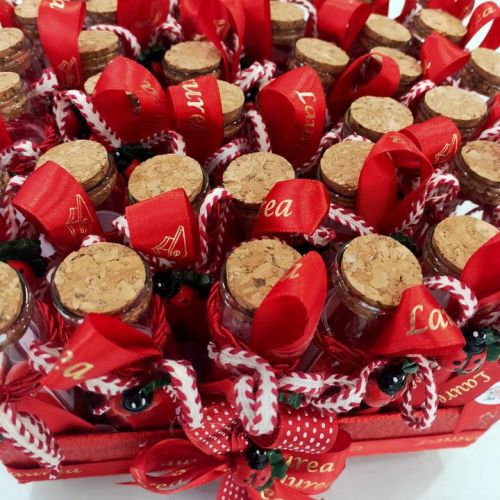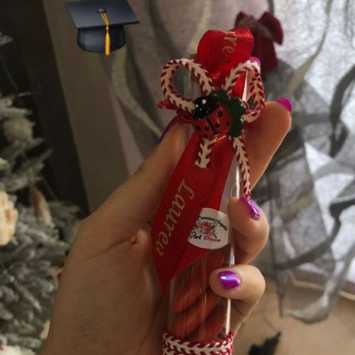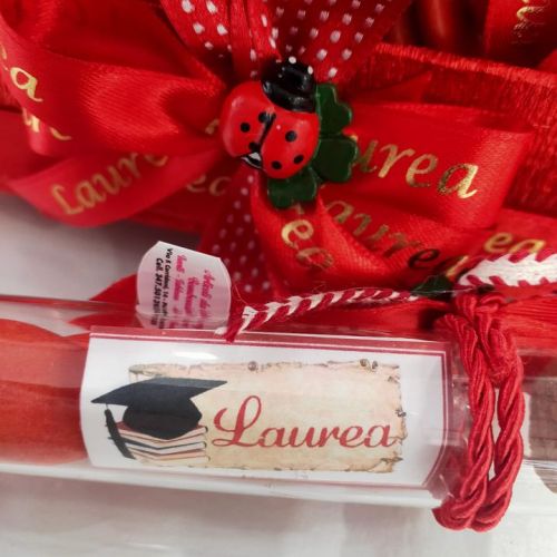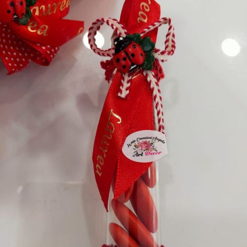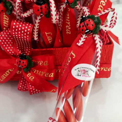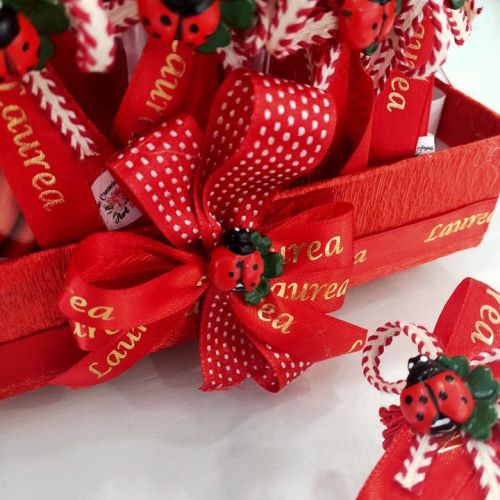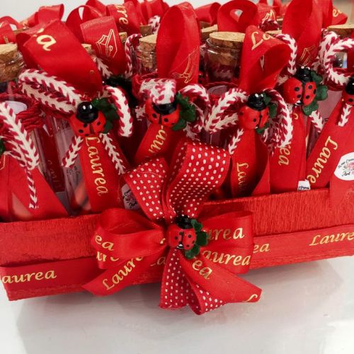 ๐Per ringraziare parenti ed amici Giulia ha scelto una provetta in vetro decorata a mano con fiocco, cordonetto rosso e ๐ coccinella, naturalmente confetti di colore rosso.