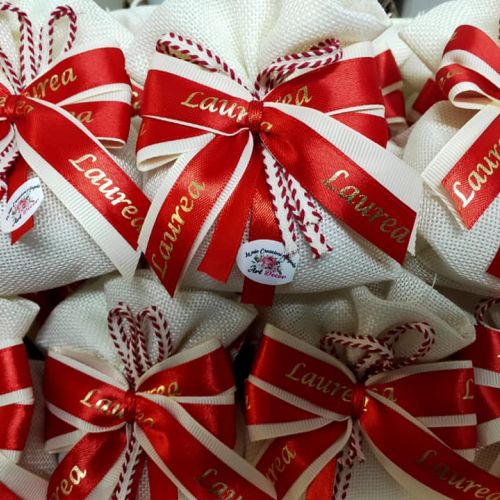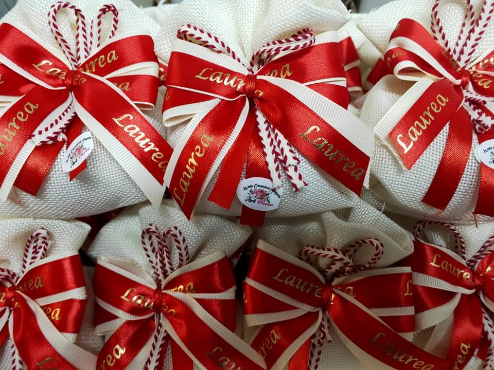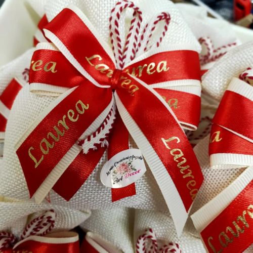 ๐Sacchetto in juta panna con fiocco bicolore panna e rosso e cordino in filo.