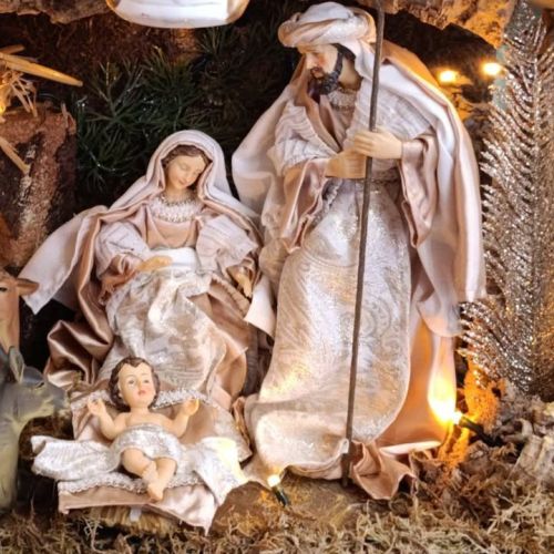Le statuine in resina color panna (Sacra Famiglia, Re Magi, bue e asinello) offrono un look moderno e raffinato.