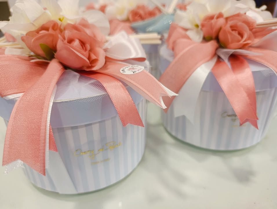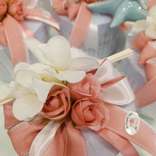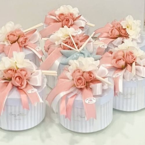 Il confezionamento è stato pensato con cura: una scatola cubo, abbinata a un grande fiocco rosa antico e bianco decorato con fiorellini a contrasto, per dare carattere e raffinatezza al risultato finale.