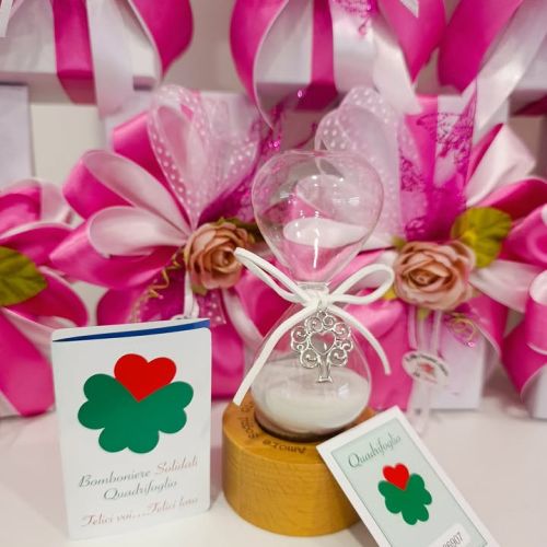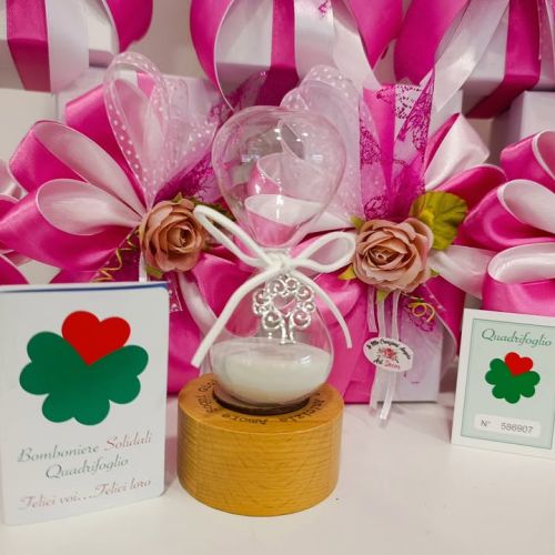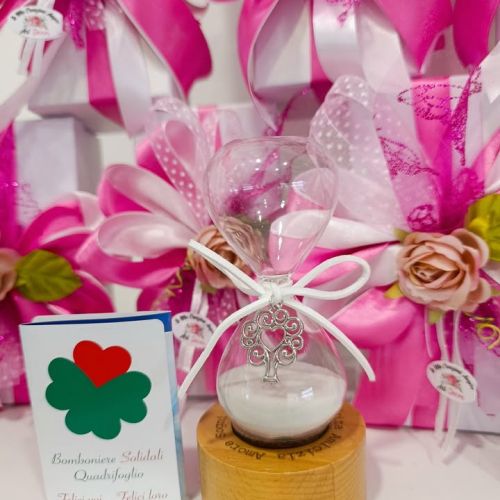 ogni clessidra è accompagnata da un certificato numerato quadrifoglio di ETM Bomboniere a testimonianza del contributo reale e concreto a sostegno della Fondazione ABIO, impegnata ogni giorno a fianco dei bambini ricoverati e delle loro famiglie negli ospedali.