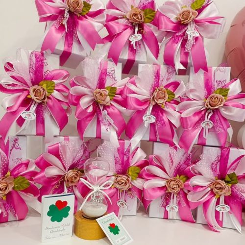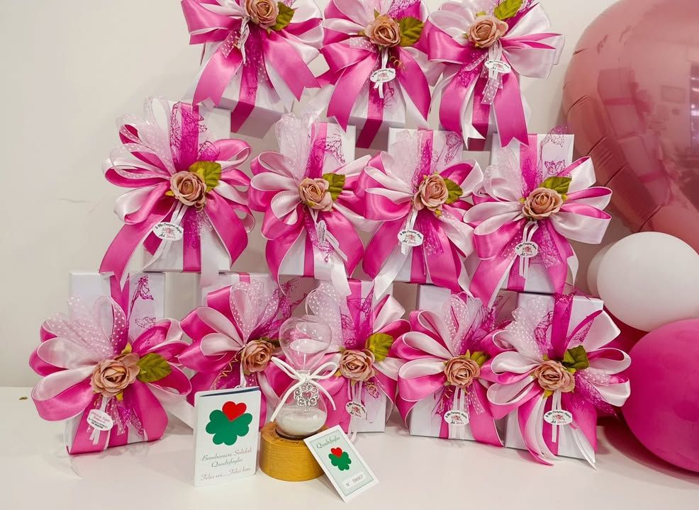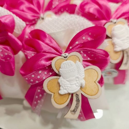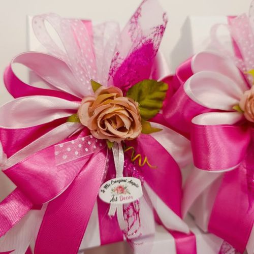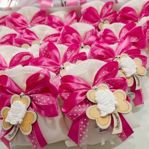 La confezione, curata con amore e attenzione, unisce fucsia e rosa antico, decorata con un elegante tulle lux e delicate farfalle, simbolo di trasformazione e leggerezza.