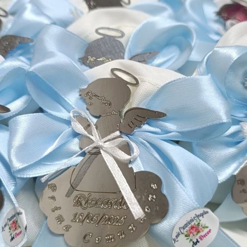 In coordinato, sacchettini e segnaposto con l’angelo personalizzato, per ringraziare ogni ospite con un pensiero raffinato e carico di affetto.