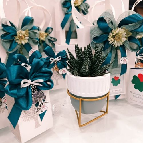 Come bomboniera, un raffinato vasetto con piantina grassa in una shopper bianca con finestra. La piantina grassa รจ un simbolo di resilienza, vita e crescita, perfetta per rappresentare la fede di Edoardo che fiorisce, lasciando un ricordo vivo e duraturo negli anni.