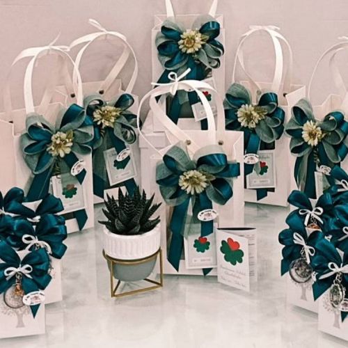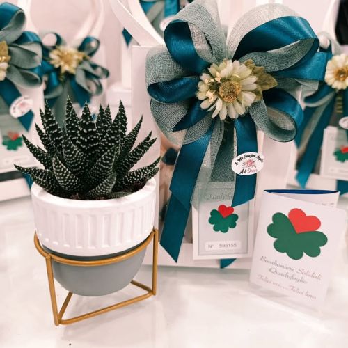 Il confezionamento รจ stato curato nei toni del verde (colore della speranza e della vita) con un elegante fiocco bicolore e delicati fiorellini, che richiamano la natura e la piantina grassa.
