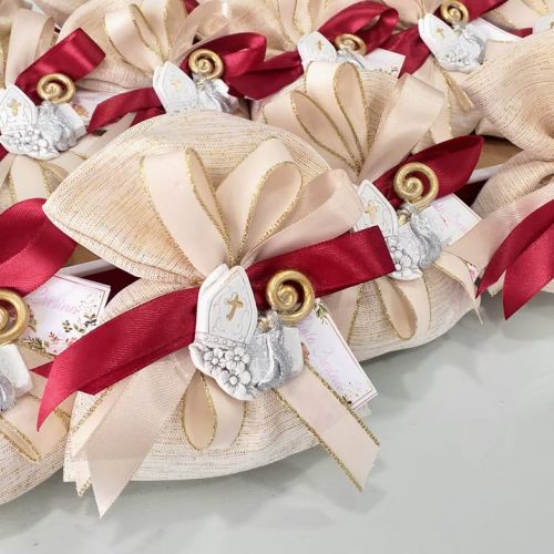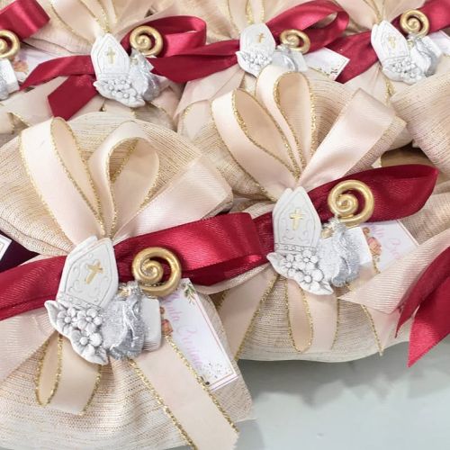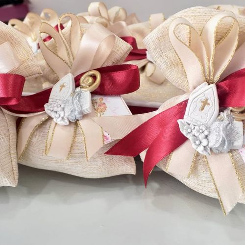 I sacchetti in tessuto beige e oro, impreziositi da dettagli in rosso bordeaux con magnete a simbolo della Cresima, hanno reso il tutto ancora più speciale.