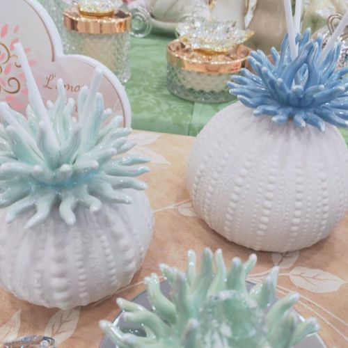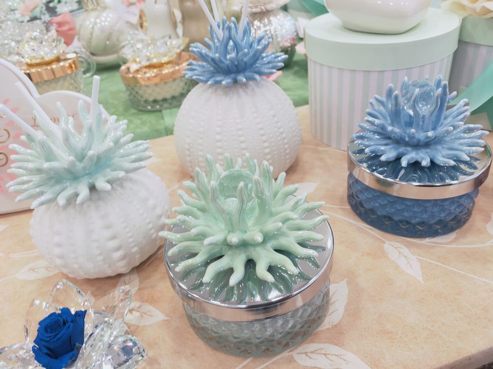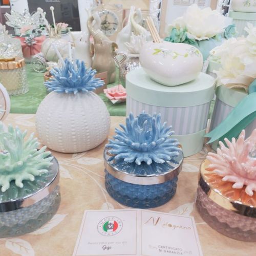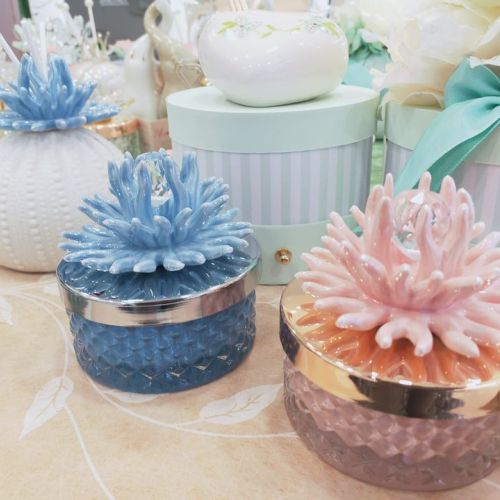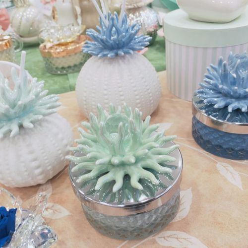 Candele e profumatori in vetro diamond elegante con tappo dorato o argentato con decoro tema mare corallo in ceramica colorato.