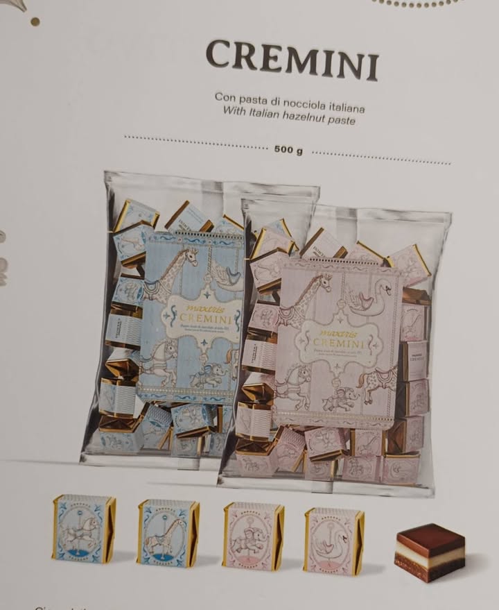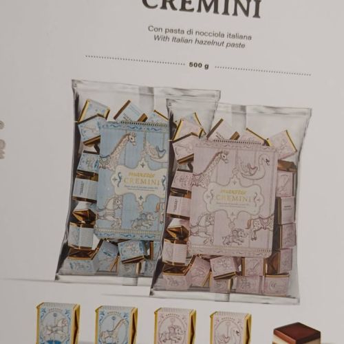 Disponibili anche i golosissimi **cremini con pasta di nocciola**, avvolti in eleganti incarti **rosa e celeste**, perfetti per rendere ancora più dolce ogni occasione.