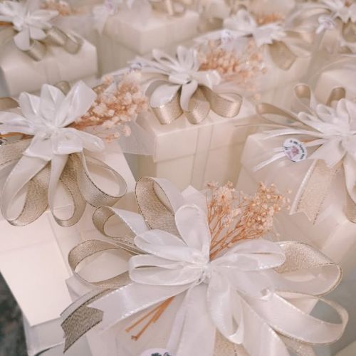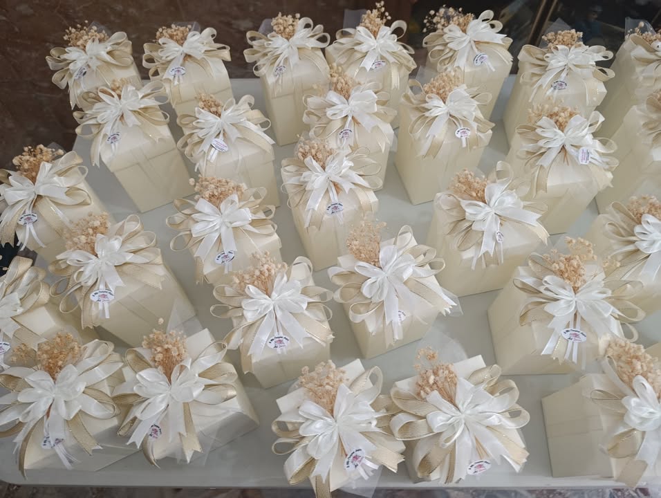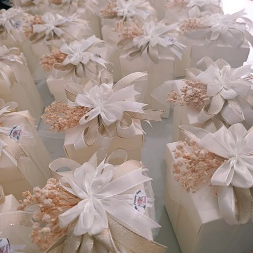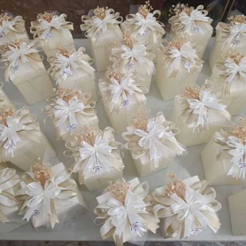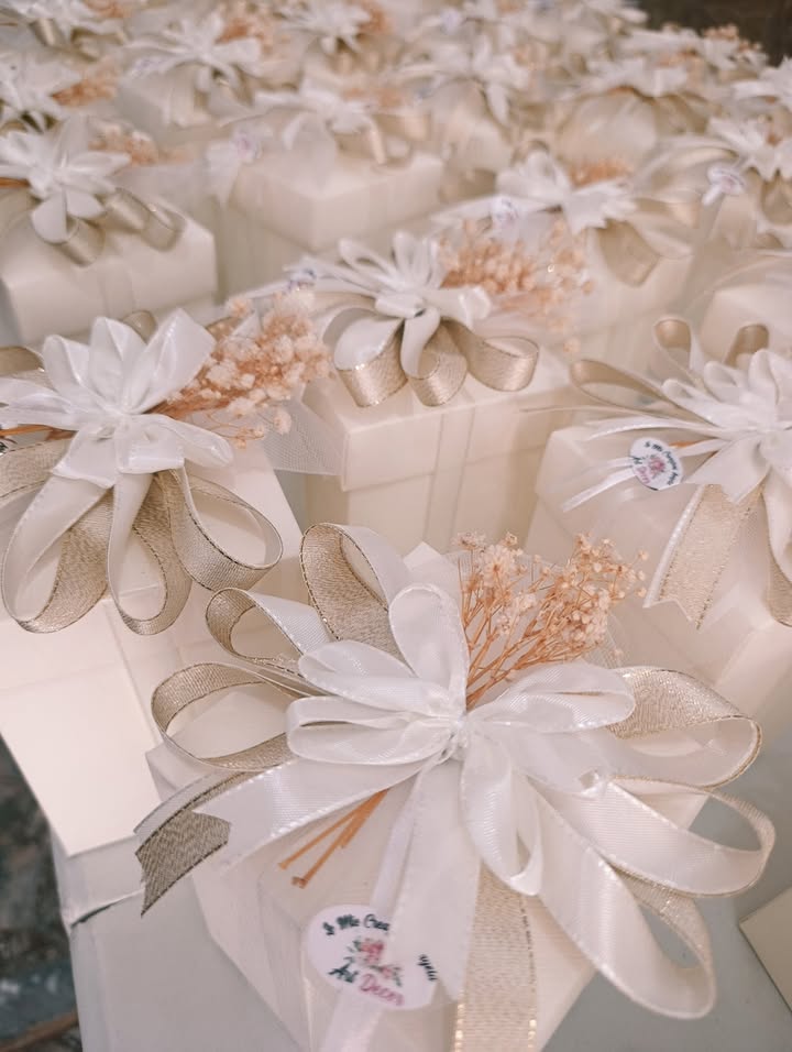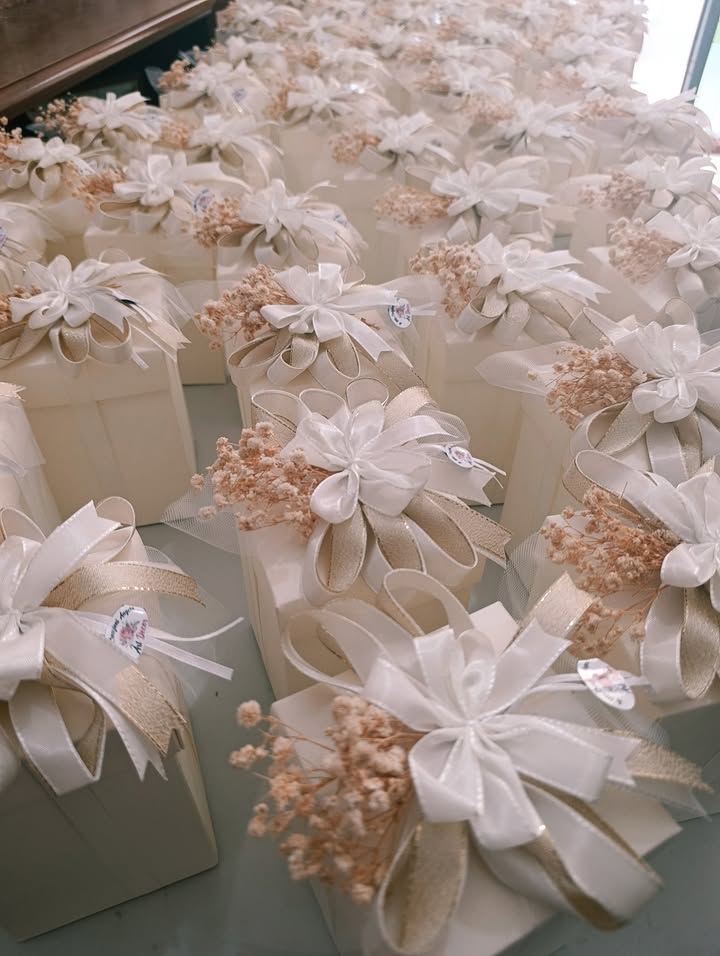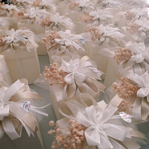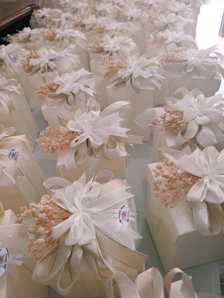 Così è stato con Filippo e Martina: quando mi hanno chiesto di occuparmi del confezionamento delle loro bomboniere, ho sentito subito il desiderio di creare qualcosa che rispecchiasse davvero i colori e l’atmosfera del loro giorno speciale. Ho cercato con cura la scatola perfetta, ho studiato il fiocco giusto e, passo dopo passo, ho dato forma a un sogno.