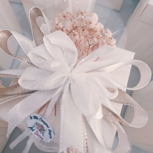 🎀 Un doppio fiocco bianco e oro, arricchito dal raso bianco lamé, rifinito da una delicata nebbiolina panna dorata: un insieme armonioso capace di raccontare eleganza, raffinatezza e amore.