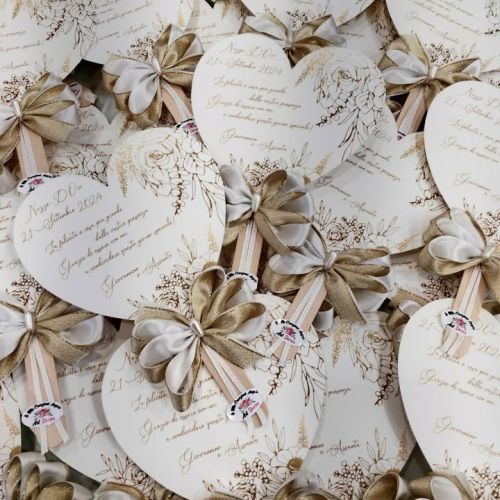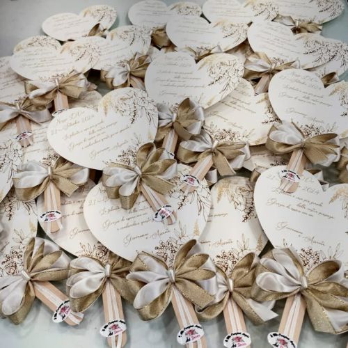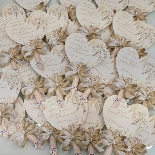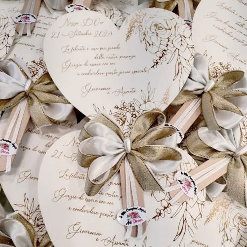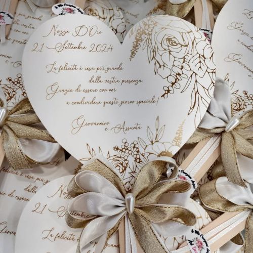 💛Il segnaposto a forma di cuore, un ventaglio decorato in oro, con fiocco panna e oro, è stato pensato per lasciare un dolce ricordo agli invitati, con una dedica personalizzata.