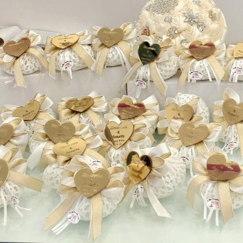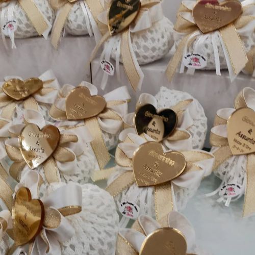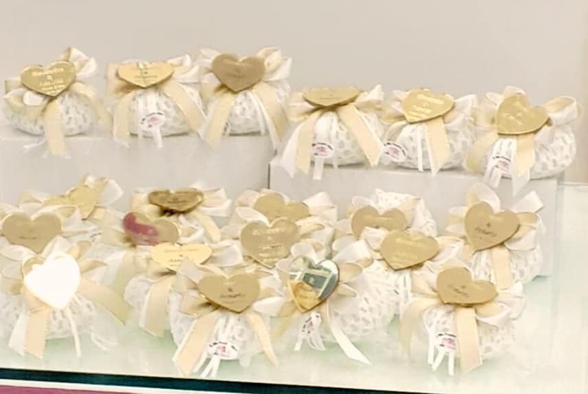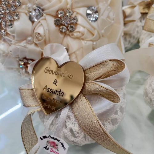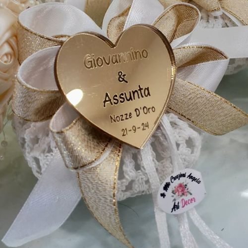 💛La signora Assunta, con la sua maestria, ha realizzato un centrino all’uncinetto che ha arricchito il cadeau a ricordo.✨Io mi sono occupata del resto, realizzando per loro dei fiocchi bianco e oro con una calamita personalizzata in plexiglass oro, incisa con i loro nomi e la data di questo giorno indimenticabile.