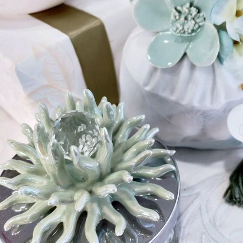 Scopri l’esclusiva linea “Mare”, pensata non solo per gli sposi, ma anche per altre occasioni speciali come la Prima Comunione, la Cresima e gli anniversari. Elegante e raffinata, questa collezione include profumatori d’ambiente e candele profumate in ceramica, disponibili in varianti di colore – verde acqua, Avion, bianco perla e rosa tenue.