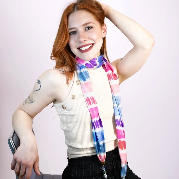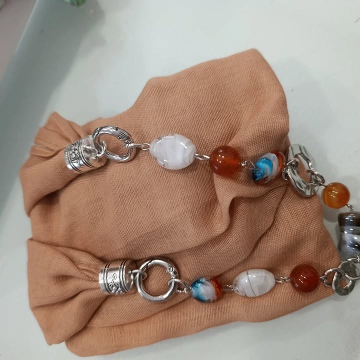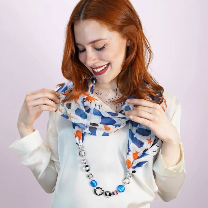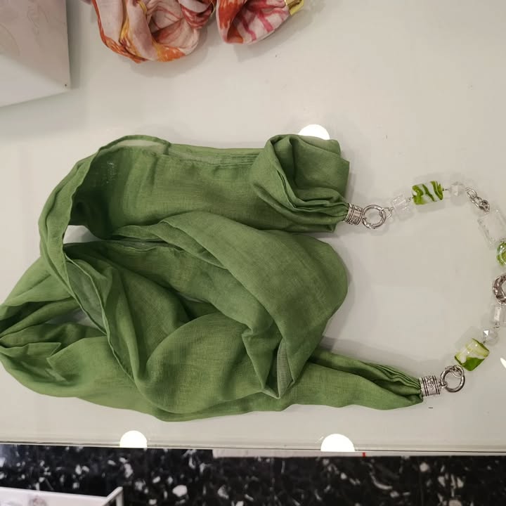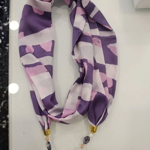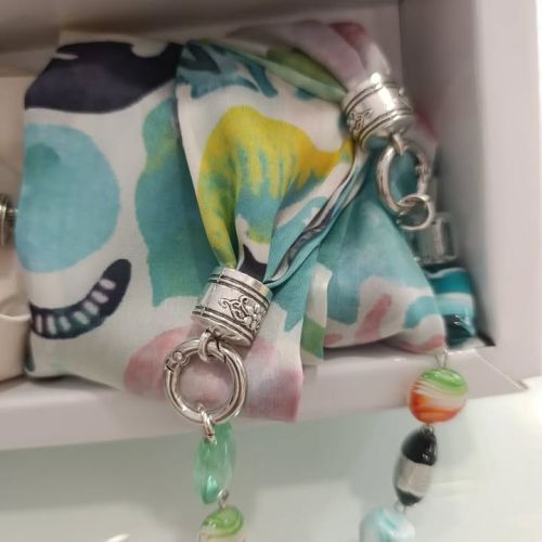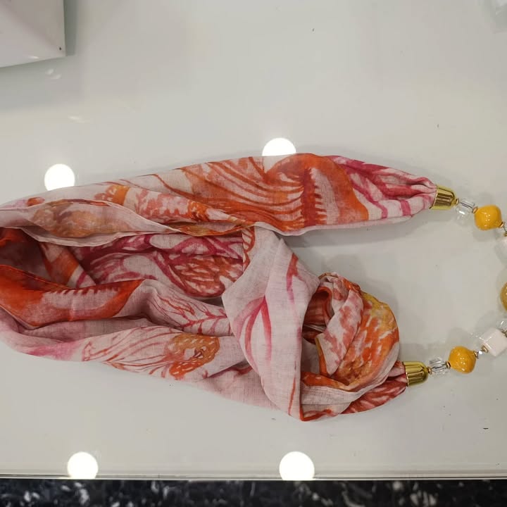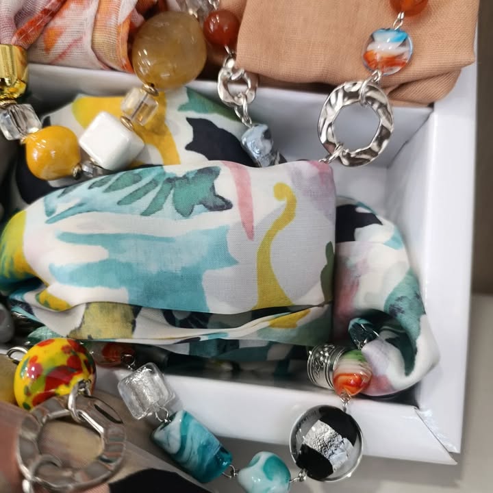La nostra sciarpa-gioiello unisce leggerezza e carattere: un tessuto morbido dai colori vivaci incontra un gioiello centrale che cattura l’attenzione.