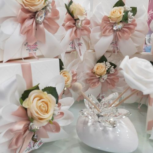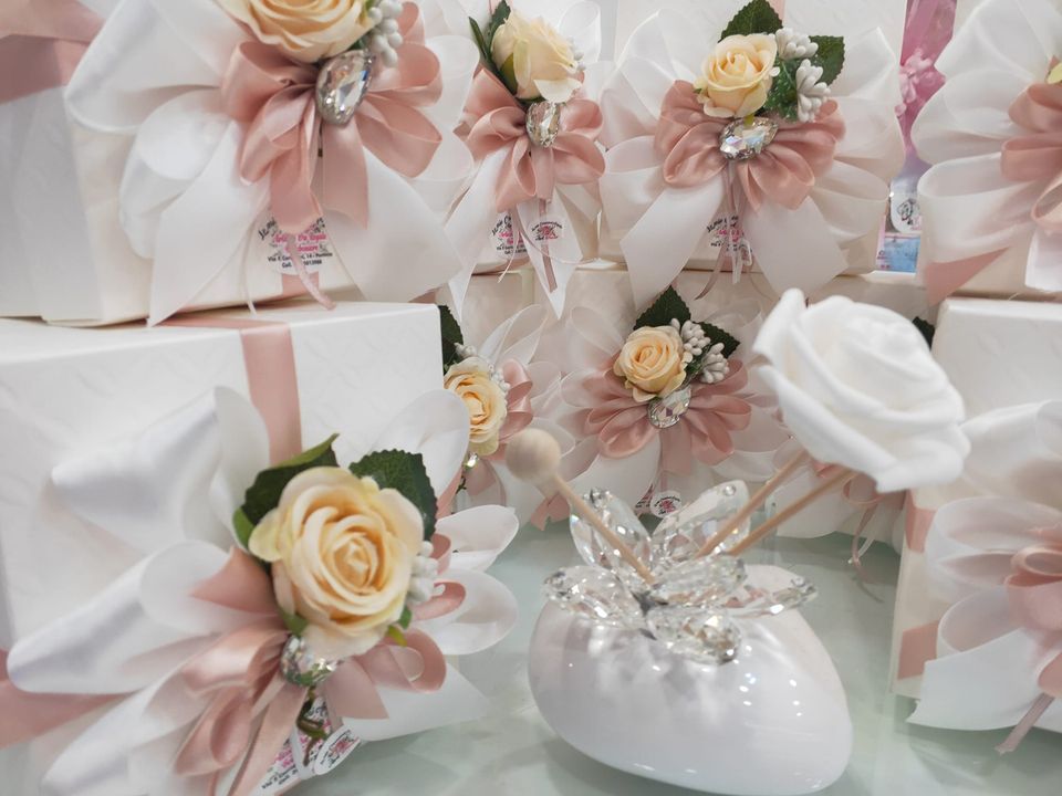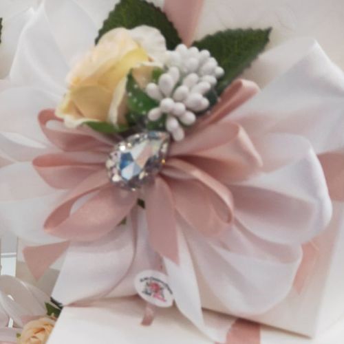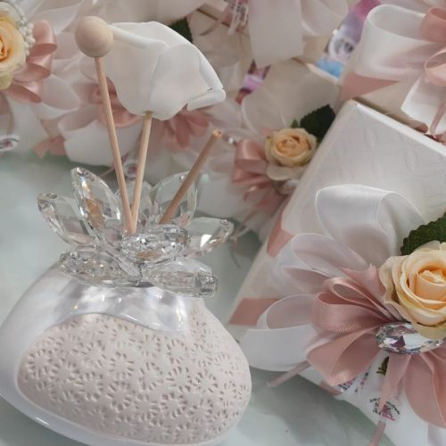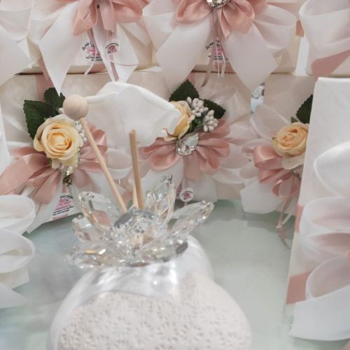 💎Confezionamento con fiocco bianco e cipria, fiore e goccia in cristallo.