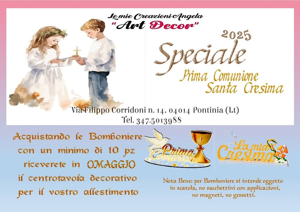 Le Mie Creazioni Angela “Art Decor” è pronta a rendere ancora più speciali i tuoi momenti indimenticabili! Con una vasta selezione di oggetti unici e personalizzati per ogni evento, il mio impegno è quello di confezionare ogni bomboniera con passione, cura dei dettagli e una grande attenzione alla qualità.